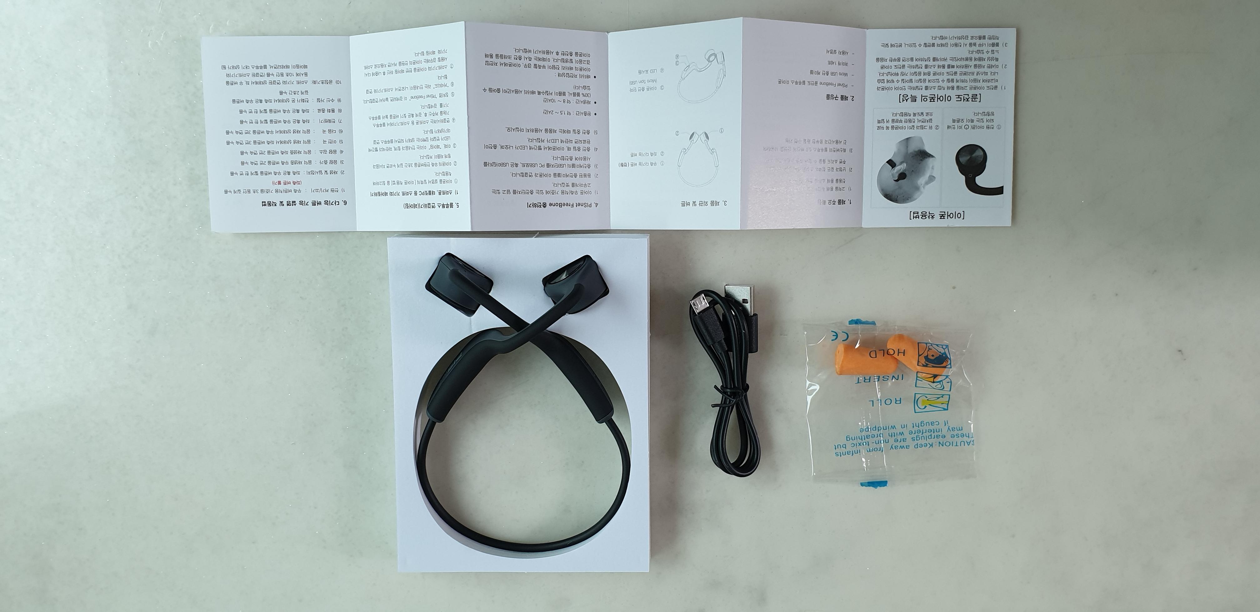 구성품으로는 이어폰 이외에 설명서와 충전기 귀마개가 있다. 실제로 골전도 이어폰은 귀마개를 하고 음악을 들으면 음악이 더 세세하고 풍부하게 들린다. 신기한 경험이다.
